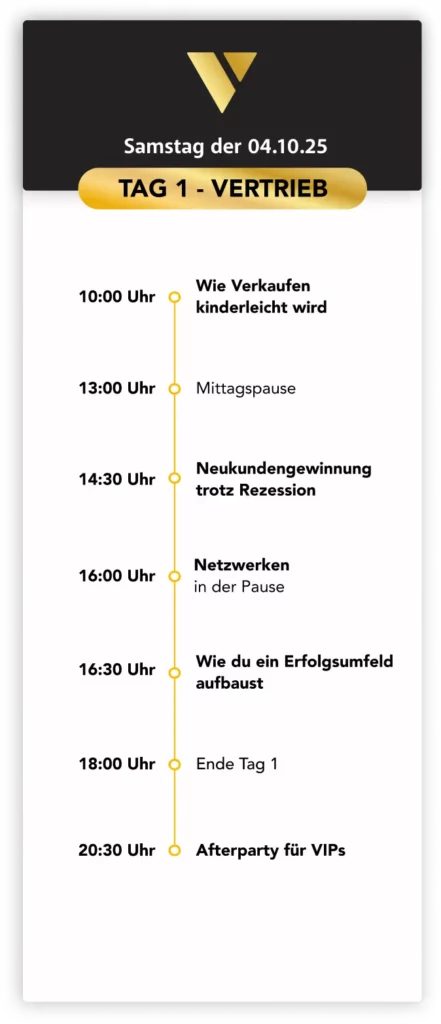 Auf der Vertriebsoffensive 2025 gibt sich das Who is Who der deutschsprachigen Wirtschaft die Hand. Und du bist mittendrin. Das bringt dir zahlreiche wertvolle Geschäftskontakte von Unternehmern, mit denen du dich auf Augenhöhe austauschen kannst.