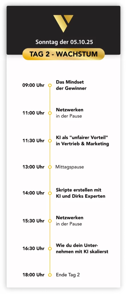Die Vertriebsoffensive 2025 ist komplett neu konzipiert und interaktiver als je zuvor. Statt nur zuzuhören, erarbeitest du gemeinsam mit Dirks Expertenteam sofort einsetzbare Vertriebswerkzeuge für dein Unternehmen. Du erhältst exklusive KI-Prompts für hocheffektive Verkaufsskripte, konkrete Anleitungen für digitale Kundengewinnung und Zugang zu Deutschlands erfolgreichsten Unternehmern. Die Kombination ist im DACH-Raum einmalig.